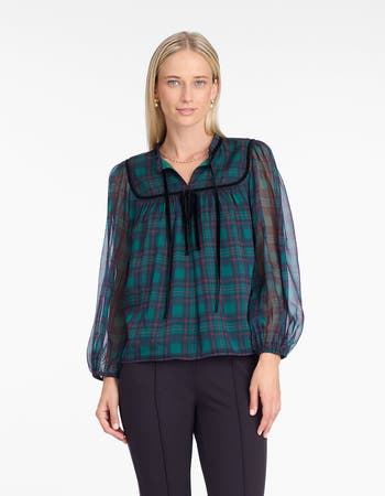 The Bow Long Sleeve Top in Evergreen Tartan is a feminine take on a timeless plaid blouse. Designed in a sheer, lightweight fabric, it features a statement bow tie neckline, subtle gathering, and softly billowed sleeves for an elegant yet easy fit. The rich evergreen tartan pattern adds a festive, seasonal touch while the relaxed silhouette makes it perfect for both day and evening wear. Pair it with tailored trousers for the office or dress it up with a skirt and heels for holiday gatherings.
