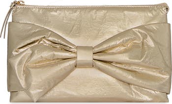 An oversized bow adds a playful flourish to this crinkle-textured metallic clutch that brings an elegant finishing touch to your date-night look.