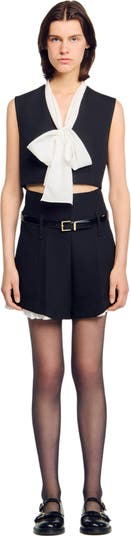 Sleeveless crop top with a contrasting V-neck lavallière collar.