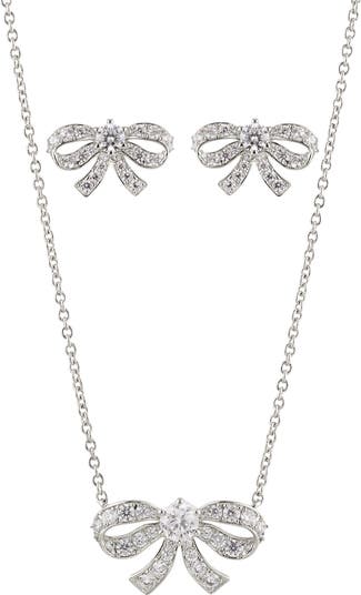 Cinch shine in your ensembles with this darling set featuring dazzling bows on studs and a pendant necklace.