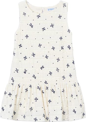 A playful yet refined dress designed with charming details, perfect for casual days or semi-formal occasions. Its textured finish and gathered skirt bring both comfort and style to little wardrobes. Round neckline with a sleeveless cut for ease of wear. Drop-waist silhouette with a gathered skirt for added movement.