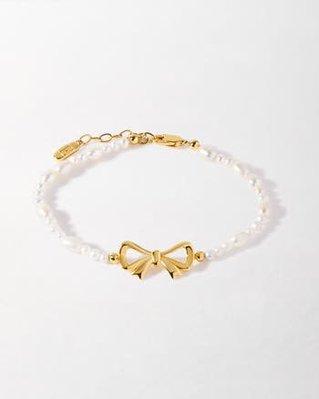 Classic bows, but make them gold.We're seeing these chic, timeless bow symbols everywhere this season, and we're obsessed.Get all tied up in these bow pearl bracelet, the perfect excuse to shine.