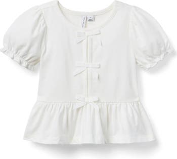 Rows of bows for this favorite in soft cotton jersey. With puff sleeves, a peplum hem and ruffle cuffs for extra frills.