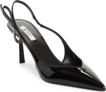 A bow at the slender slingback strap adds a playful flourish to this patent calfskin pump framed with a sharp pointy toe and sculptural heel.