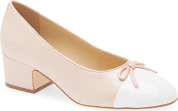 The NYC-based designer draws inspiration from vintage aesthetics with this classic cap-toe pump detailed with a dainty bow for a house-signature touch of whimsy.