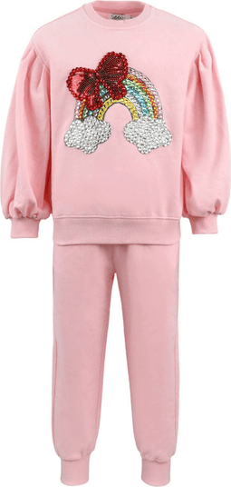 Fun and vibrant two-piece set featuring a sweatshirt with a dazzling bow and rainbow gem embellishments, paired with matching joggers. Made with soft and breathable fabric for all-day comfort and effortless style. Perfect for brightening up casual outings or adding a playful touch to any wardrobe.