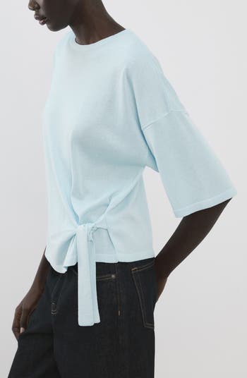 Lightweight and finely knit, this breezy sweater features extended short sleeves and a tie at one side to create a chic, asymmetric look.