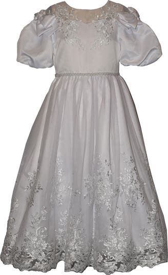 This satin communion and flower girl dress is full special details like an illusion neckline, lace appliques on the bodice and a scalloped lace hem. Short puff balloon sleeves with bows add a unique romantic flare to this style.