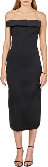 Make an entrance in this strapless midi tube dress defined by a wide bow that sits flat across the neckline. The sleek, body-skimming silhouette keeps the look modern and refined, allowing the sculptural detail to take center stage.