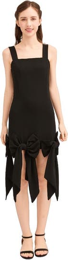 This striking sleeveless piece features a fitted silhouette with wide straps and a bold square neckline. At the hemline, two oversized bows with flowing tails transform the simple cut into a playful yet elegant statement, perfect for festive or formal occasions.