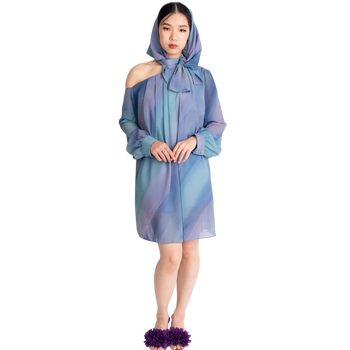 A one-shoulder crepe chiffon mini dress in our custom Azure Bloom print, styled with soft pleats, a voluminous sleeve, and an oversized bow accent.