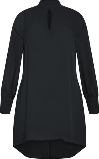 A polished tie dangles from the high mock neckline of this lightweight, longline top made with an airy keyhole cutout.