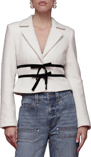 Contrasting ribbons at the waist accentuate the cropped silhouette of this updated, occasion-ready tweed jacket.