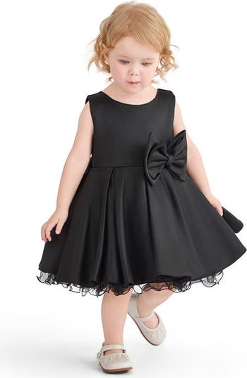 This formal sleeveless dress features a fitted bodice and a voluminous layered skirt with a sheer underlayer that peeks out at the hem. At the back, a large satin bow serves as the centerpiece, adding elegance and charm to the rich design. Perfect for weddings, parties, or holiday celebrations, it blends sophistication with festive detailing.