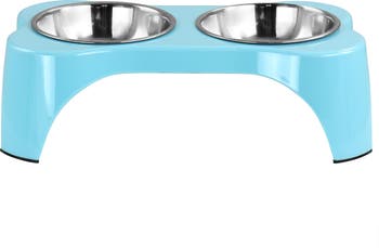 The Bow Wow Meow three piece pet bowl set is the perfect simple and space saving design for feeding small to medium pets. This set comes with two removable 13oz stainless steel bowls, making it easy to wash and fill, and one 4in tall melamine stand. Each bowl fits snugly into the sturdy base, featuring a non slip base to keep this set from sliding during feeding time. Cute bone shaped stand is constructed of durable and long lasting melamine. Both stand and bowls are dishwasher safe.