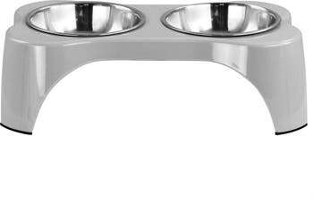 The Bow Wow Meow three piece pet bowl set is the perfect simple and space saving design for feeding small to medium pets. This set comes with two removable 13oz stainless steel bowls, making it easy to wash and fill, and one 4in tall melamine stand. Each bowl fits snugly into the sturdy base, featuring a non slip base to keep this set from sliding during feeding time. Cute bone shaped stand is constructed of durable and long lasting melamine. Both stand and bowls are dishwasher safe.