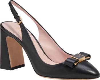 A dainty bow punctuates the pointy toe of this leather slingback set atop a flared heel.