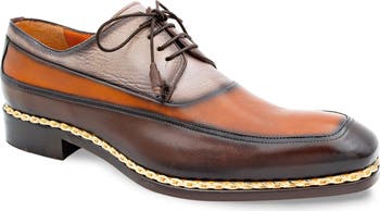 Polished chain hardware neatly wraps around the cupsole of a sophisticated derby crafted from Spanish leather complete with a mix of finishes for eye-catching appeal.