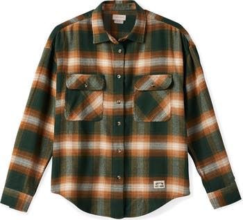 An earth-hued plaid adorns a roomy flannel shirt that channels the casual, easy-to-wear attitude of a wardrobe staple cut from a brushed cotton blend.