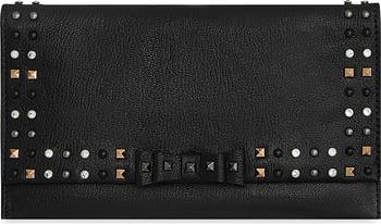 Mixed studs punctuate a delicate bow and the rich leather exterior on a slender clutch packed with pockets and slots perfect for securing your small essentials on your next night out.