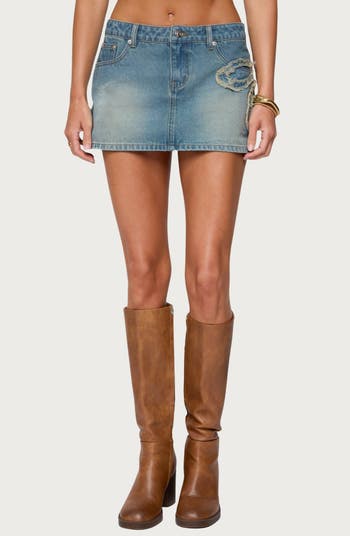 Make a statement in this nonstretch denim miniskirt featuring a fraying bow detail that decorates the side.