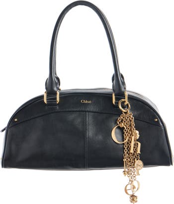 Chloé's elevated take on a timeless bowling bag features a curved silhouette made from soft leather and embellished with a key chain detailed with iconic charms that nod to the label's heritage.