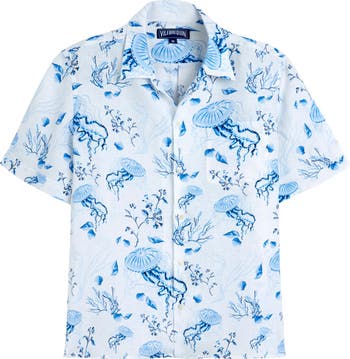 A stylish bowling shirt crafted from cool linen and featuring an eye-catching ocean-inspired print. The chest pocket and tonal turtle on the hem complete the detail.