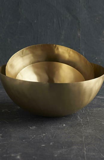 Organically shaped bowls in graduated sizes provide an updated alternative to the classic wooden fruit bowl or wicker bread basket. Crafted by hand from thin brass sheet, these deep bowls feature a food-safe satin finish making them ready for a variety of serving duties throughout the home. When not in use, the gracefully contoured bowls nest for simple storage and easy portability.