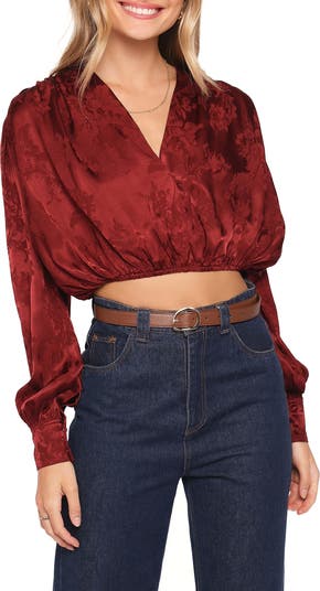 Evening-ready allure meets soft romance in this floral jacquard satin crop top. The V-neckline and fluid long sleeves strike an elegant note, while covered buttons at the cuffs add a refined finish. An elastic waist brings gentle shape to the silhouette, making it a luminous, easy-to-wear piece for nights out.