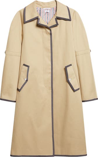 Raglan sleeves further the rounded silhouette of this runway-featured coat tailored from a single continuous panel that wraps from front to back with no side seams. Grosgrain frames all of the edges, highlighting the virtually full-length back vent, and anchor-detailed buttons literally anchor the placket, pocket flaps and self armbands.