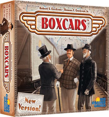 BOXCARS is the classic game of railroading that has been played by generations of railroad game fans. Build your own rail empire by acquiring existing railroad companies. Fund your acquisitions by delivering freight across the country. The player who builds the most effective empire and accumulates the most wealth will win the game. Play on a new version of the original U.S. BOXCARS map board or the new map board of England, Scotland, and Wales. In BOXCARS, the players take the roles of rail barons. As rail barons, the players deliver freight from city to city, collecting money for their efforts. They use the money earned to acquire railroad companies, to build an ever-expanding railway network. The players begin with money and no railroads. Players select their Home Cities from randomly determined regions and, from there, begin the game. The game consists of a series of trips (different for each player, with the destination of each trip randomly chosen). At the end of each trip, the player earns a payoff for the trip and can buy a railroad or improved train before beginning his or her next trip. Players use their purchases to build their own railway networks, which they can use for no cost on subsequent trips (a player must pay when moving on the rail lines of companies he or she does not own). A player will also earn money when other players move on rail lines of companies he or she owns. Players use their purchases to build railway networks that allow them to deliver goods at the lowest possible movement costs. It takes both skill in building a rail empire and also a little luck to win the game by returning to the Home City with the required fortune.