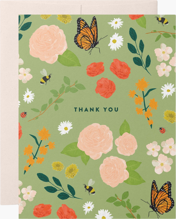 Brighten someone's day with the "Garden Floral" Thank You Boxed Set—featuring a vibrant botanical design of blooming roses, delicate wildflowers, and fluttering butterflies on a soft green background. This elegant set of 8 blank greeting cards is perfect for expressing gratitude with a heartfelt, handwritten note.