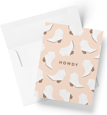 Kick up some fun with the "Howdy" Pink & White Cowboy Boots Pattern Boxed Set—a charming collection of 8 blank greeting cards featuring a playful Western boot design on a soft pink background.
