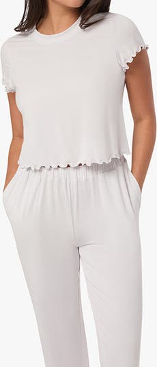 - Made from stretch modal jersey, this cropped tee is cut for a boxy fit with a classic crewneck, short sleeves, and wavy lettuce edges. Boxy fit Short sleeves Lettuce edge hem at sleeve opening and bottom opening Cropped length Crewneck 92% Modal 8% Spandex Machine wash with like colors. Do not bleach. Tumble dry low. Iron cool. Do not dry clean.
