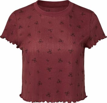 Made from stretch modal jersey, this cropped tee is cut for a boxy fit with a classic crewneck, short sleeves, and wavy lettuce edges. Boxy fit Short sleeves Lettuce edge hem at sleeve opening and bottom opening Cropped length Crewneck 92% Modal 8% Spandex Machine wash with like colors. Do not bleach. Tumble dry low. Iron cool. Do not dry clean.