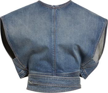 This boxy denim top cut with dolman cap sleeves and deep armholes is anchored to the midriff with long wraparound ties. This distinctive style is weathered with a heavy wash and sandblasting for an authentic patina.