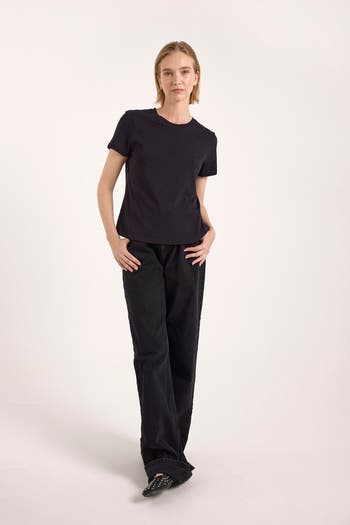 A softly structured crew tee that drapes relaxed over the frame, breathable and ideal for slow weekends and city strolls.