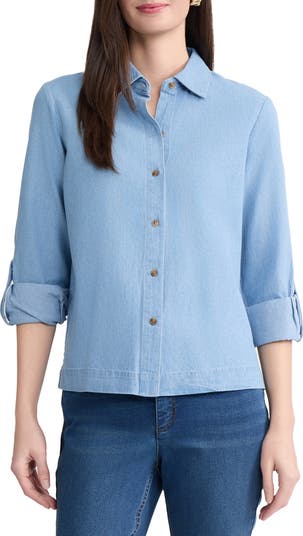 Roll-tab cuffs keep the look casual and easygoing in a nonstretch denim button-up shirt fashioned in a boxy silhouette ideal for leaving untucked.