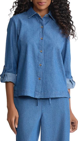 Roll-tab cuffs keep the look casual and easygoing in a nonstretch denim button-up shirt fashioned in a boxy silhouette ideal for leaving untucked.