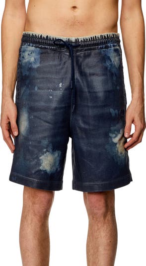 A unique bleach wash with faded spots means standout style in these stretch-kissed denim shorts that have a drawstring waist for a custom fit.