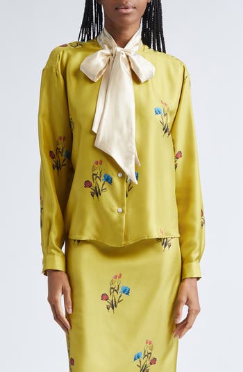 Allover bouquets bring the house’s playful spirit to a silk button-up that feels modern thanks to its clean, boxy cut. The attached scarf streams from the collar and styles three ways—bowed tight, knotted loose or tossed over one shoulder for a wink of movement.