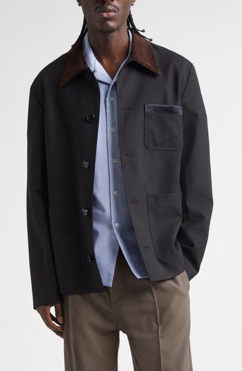 Clean cut and quietly striking, this boxy workwear jacket distills the label’s eclectic spirit into tropical wool that breathes with ease and keeps proportions crisp. A velvety collar frames the face, a satin chest-pocket flash catches light and a genuine calf hair top button delivers tactile punctuation.
