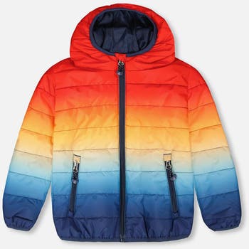 Our quilted polyester mid-season jacket with orange and blue gradient combines warmth, practicality, and everyday style. Designed with horizontal quilting and soft insulation, this jacket features a durable fluorocarbon-free BIONIC-FINISH® ECO coating and a 5,000 mm polyurethane waterproof layer for protection against light rain. Complete with zipper pockets and an attached hood, this jacket keeps kids dry, warm, and comfortable in every season.