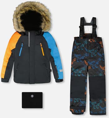 Waterproof, breathable, and insulated for cold protection down to -30°C (-22°F), our two-piece PLAY ski suit jacket is designed for maximum comfort, warmth, and performance in the snow. This winter snowsuit features a fleece-lined jacket with a detachable and adjustable hood, articulated sleeves for improved range of motion, elastic cuffs, a snow skirt, expandable sleeves so you can adjust the length as the child grows, and a protective wind flap and chin guard. The pants are constructed with Cordura-reinforced panels for long-lasting durability, articulated knees, adjustable and removable suspender straps, ankle snow guards, and zippered pockets to hold ski passes and other essentials.
