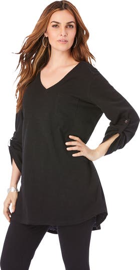 This oversized V-neck tunic has long sleeves that roll to three-quarter length and secure with button tabs. Relaxed silhouette. Curved shirttail hem. Chest pocket.