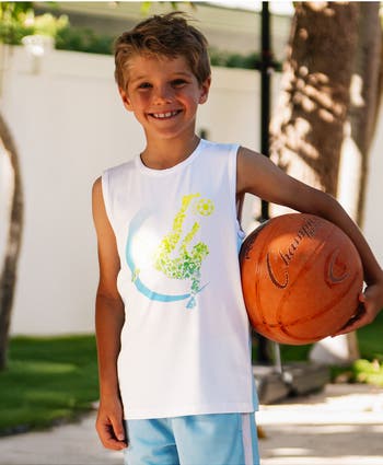 Built to move, made to play. Our Boys Active Jersey Top keeps him cool with moisture wicking technology during intense play. The UPF 50 sun protection shields his skin, while reinforced shoulder seams stand up to rough-and-tumble adventures. Front graphic adds fun style to this performance-ready essential.