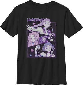 - Unleash your inner idol with this eye-catching boys' t-shirt perfect for concerts, hangouts, or everyday slaying! Featuring Rumi, Mira, and Zoey in a cartoon style and the Huntrix logo printed across the front.