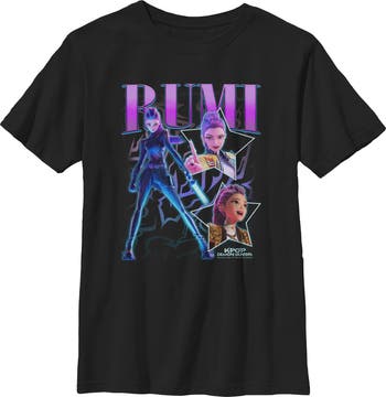 - Unleash your inner idol with this eye-catching boys' t-shirt perfect for concerts, hangouts, or everyday slaying! Featuring Rumi in her battle costume and the Kpop Demon Hunters logo printed across the front.