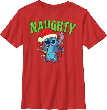 - Strut your stuff with this stylish new Christmas boys' tee that is perfect for the holidays! Featuring the adorable Stitch entangled by Christmas lights and the text "Naughty" across the front.