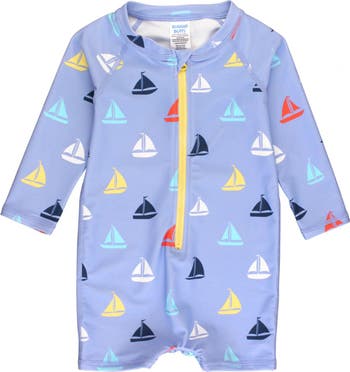 Keep your little guy safe from the sun with RuggedButts Long Sleeve One Piece Rash Guard. This full coverage one piece suit makes trips to the pool, lake or beach so easy for little crawlers.